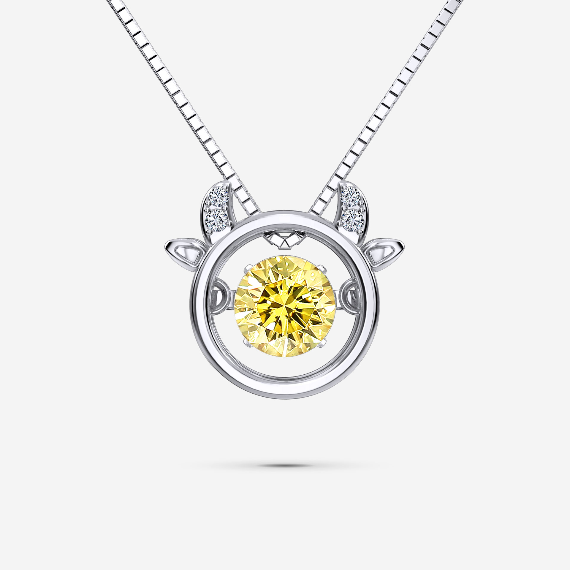 This cunning ox pendant delicately features a yellow dancing quartz diamond as the centerpiece hovered within a glistening round sterling silver frame and adorned by two shimmering horns. It eternally catches and reflects light for lots of shine and livens up your look this Chinese New Year.