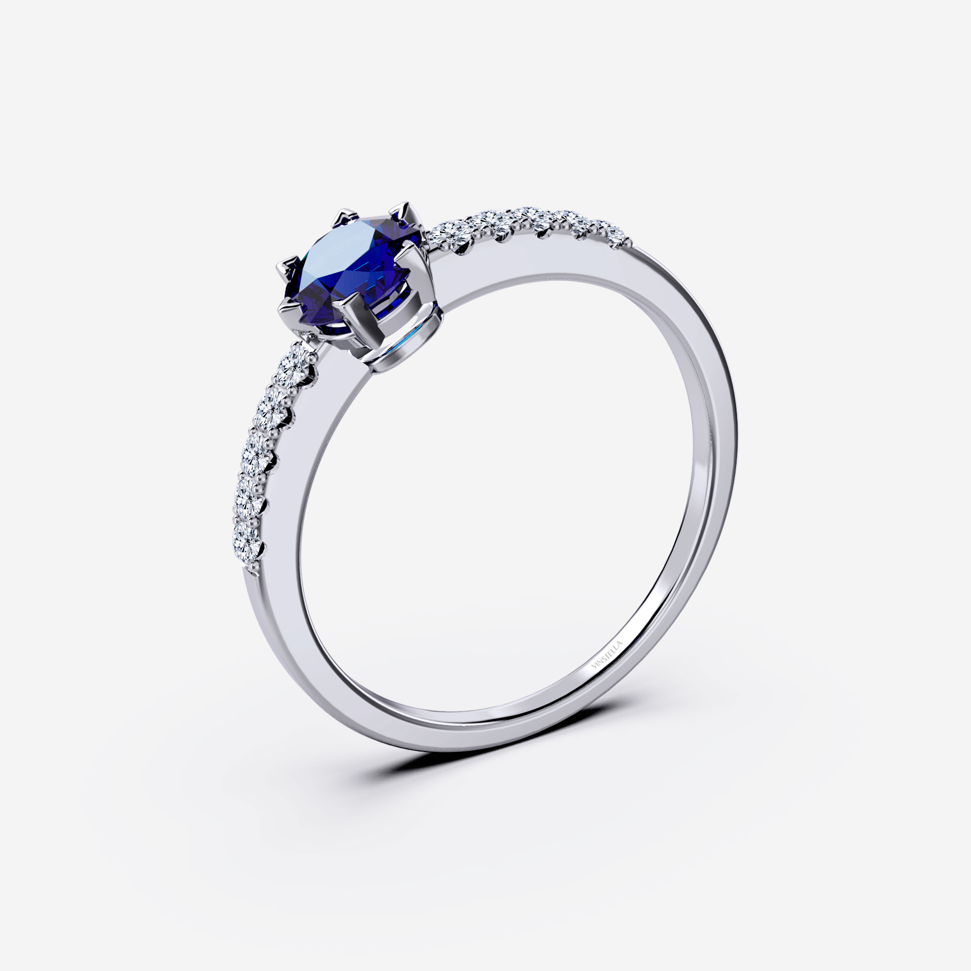 Emanating a sense of elegance and regal, this stunning ring exhibits a majestic beauty. Showcases a Vinstella Sky Sapphire embraced gracefully by a six-prong setting with shimmering ring shank that is encrusted with dainty sparkling quartz diamonds offering you perfect radiance.